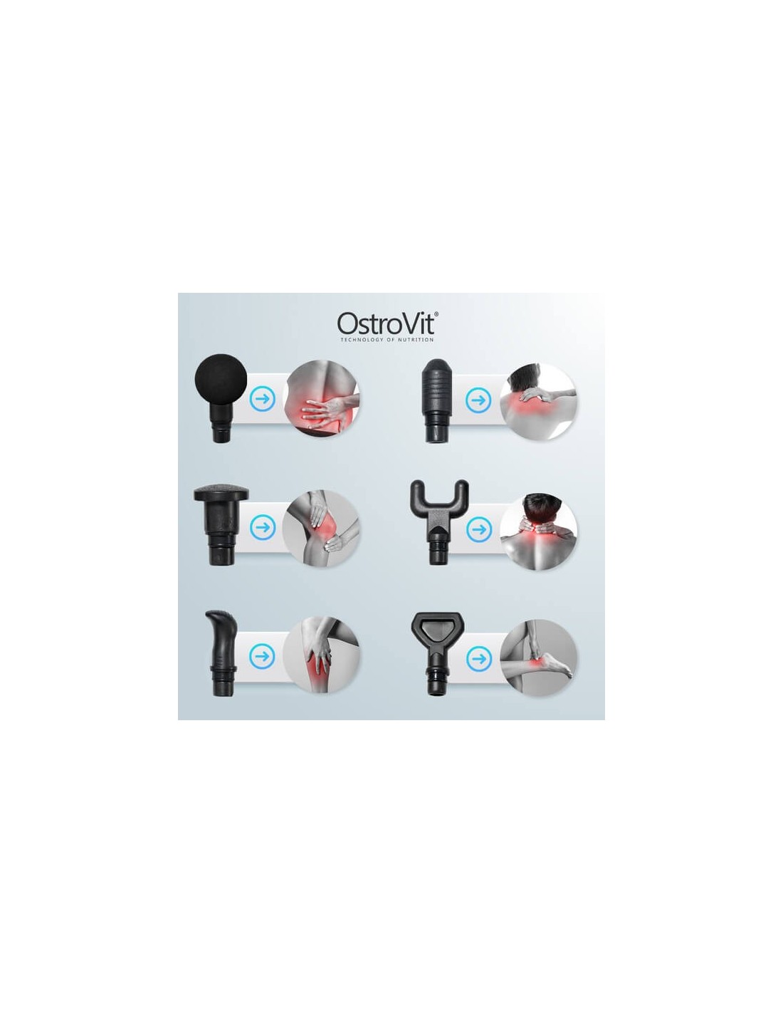 Pistolet de massage corporel d'OstroVit (pistolet massage puissant pour crossfiteur, musculation et sports force et endurance) est un produit pour l'automassage après l'entraînement et pendant la réhabilitation. Le masseur dispose de 30 modes pour différents types de massage et de 6 têtes à main pour s'adapter à toutes les parties du corps. Il conviendra aussi bien à un usage individuel qu'à des cabinets de physiothérapie.