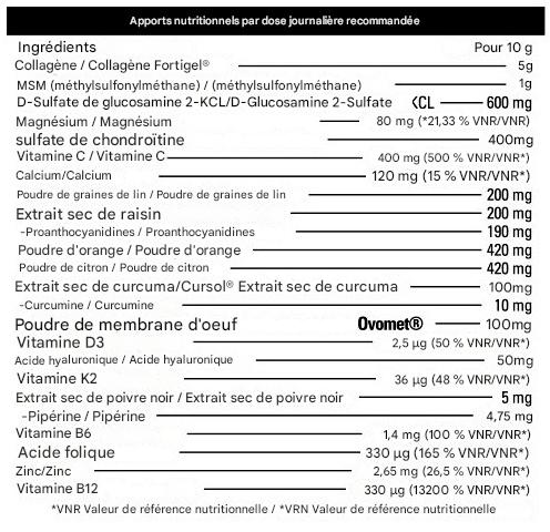 Avec des ingrédients de qualité tels que le collagène Fortigel®, le MSM (méthylsulfonylméthane), l'acide hyaluronique, le curcuma Cursol®, la membrane d'œuf Ovomet®, l'extrait de poivre noir sec, les acides gras oméga-3 d'huile de lin et de pépins de raisins, et un mélange de vitamines (B6, C, D3, K2) et de minéraux (magnésium, calcium, zinc), cette poudre permet non seulement de traiter et d'améliorer la santé des articulations.