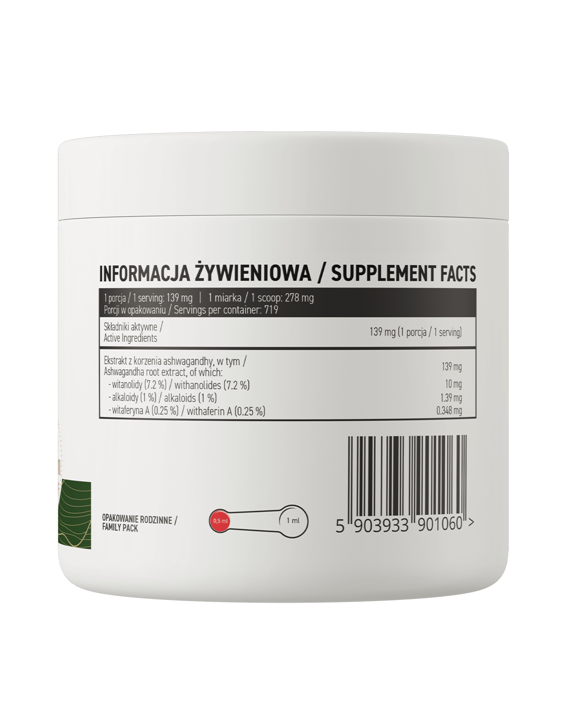 - La source de substances précieuses - Une portion du complément alimentaire apporte à l'organisme 139 mg d'extrait de racine d'ashwagandha standardisé à 7,2% de withanolides, 1% d'alcaloïdes et 0,25% de vitaférine A.